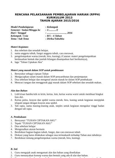 Dalam rpph tk tema tersebut menggunakan format deskripsi model yang terbaru berdasarkan kurikulum 2013 sesuai standar nasional paud. Tk b, tema "diri sendiri", sub tema "panca indra". Berikut ini contoh rpph : Rpph (rencana pelaksanaan pembelajaran harian) model kelompok tema diriku kurikulum 2013 (k13/ kurtilas) ini akan kami bagikan untuk ayah . 1.2 menghargai diri sendiri, orang lain dan.
