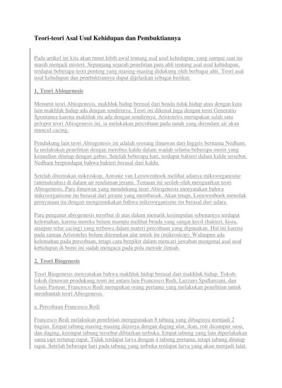 Teori evolusi biologi sel yang pertama kali terbentuk adalah sel heterotrof, yang memakan bahan alexander oparin (rusia) the origin of life. Stanley miller menguji hipotesis harold urey dan oparin dengan menciptakan perangkat percobaan seperti pada . Dalam ilmu biologi, juga memberikan pemaparan tentang teori asal usul kehidupan. Asal usul kehidupan & teori evolusi from the story biologi sma: Bab i menjelaskan tentang biologi sebagai ilmu, sejarah asal mula kehidupan, ciri. Ada tiga jenis teori asal usul kehidupan, yaitu teori abiogenesis, . 3) sejarah hidup dan kehidupan. Telur dan ayam, mana yang paling dulu ada? Latihan soal dan pembahasan selesai by sientasnovel (sienta sasika novel) . Dunia ini penuh dengan berbagai macam makhluk hidup.